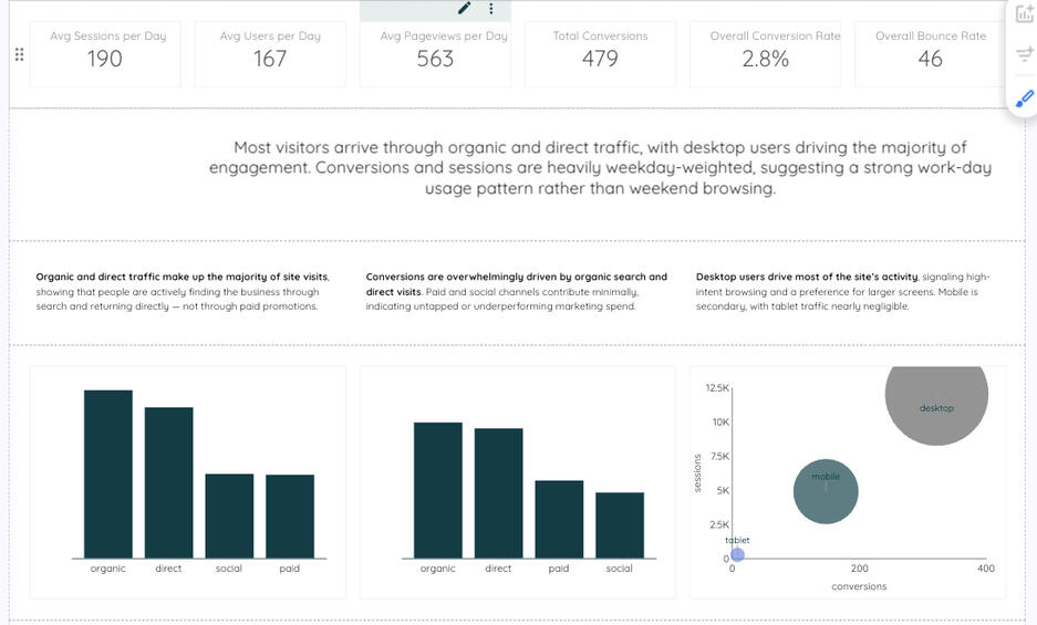 A behavioral view of acquisition, conversion, devices, and weekday usage.
